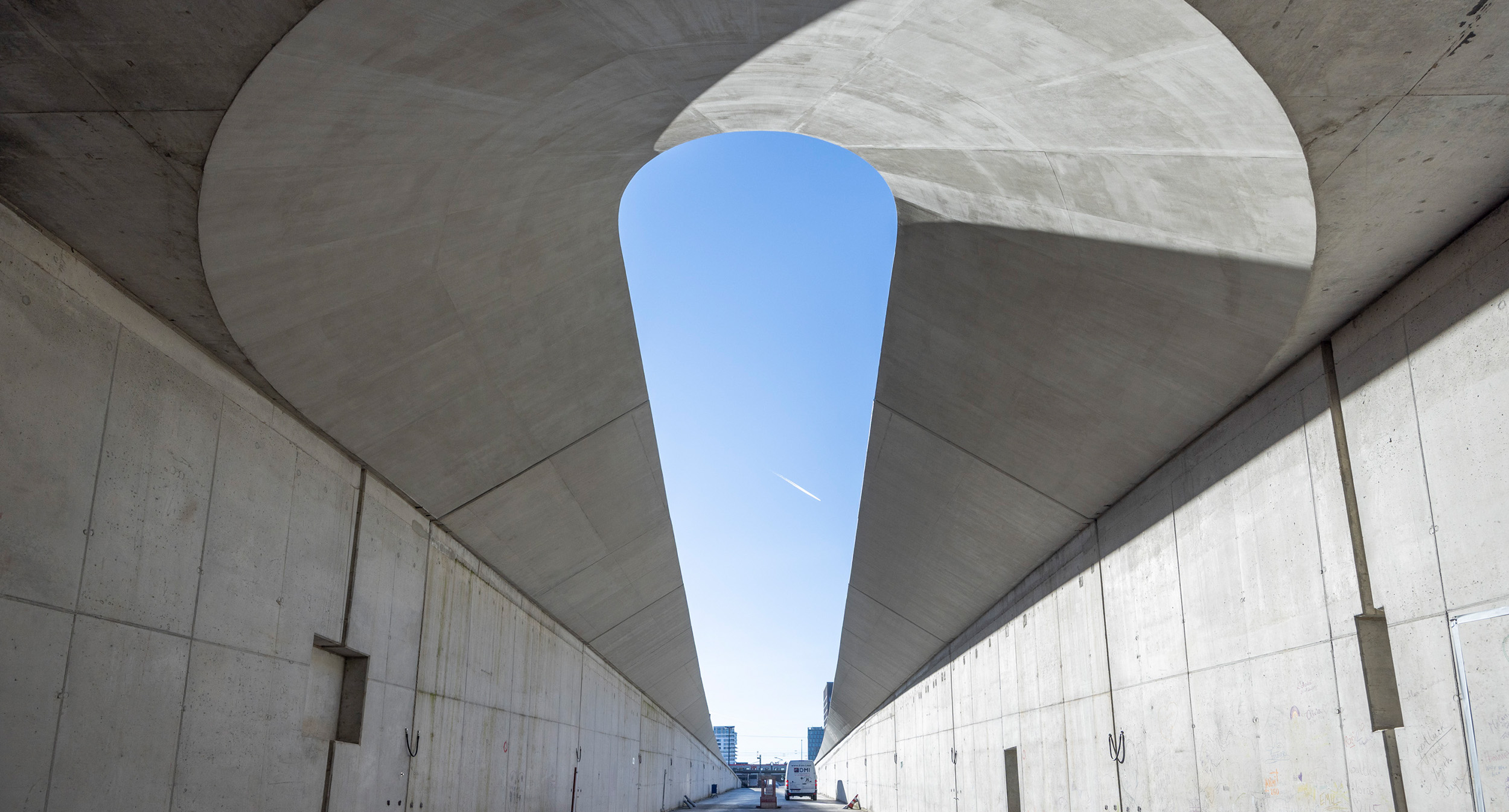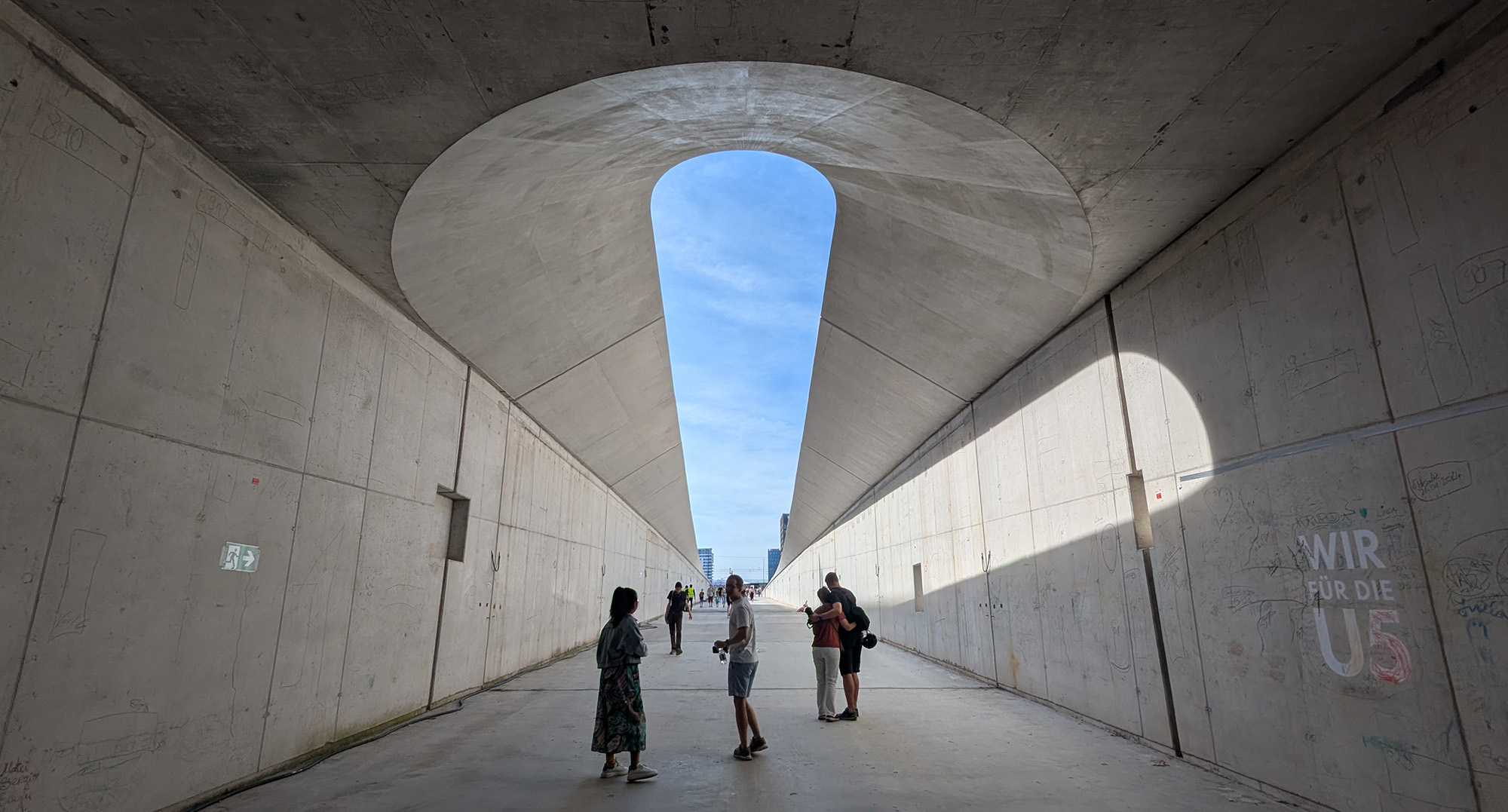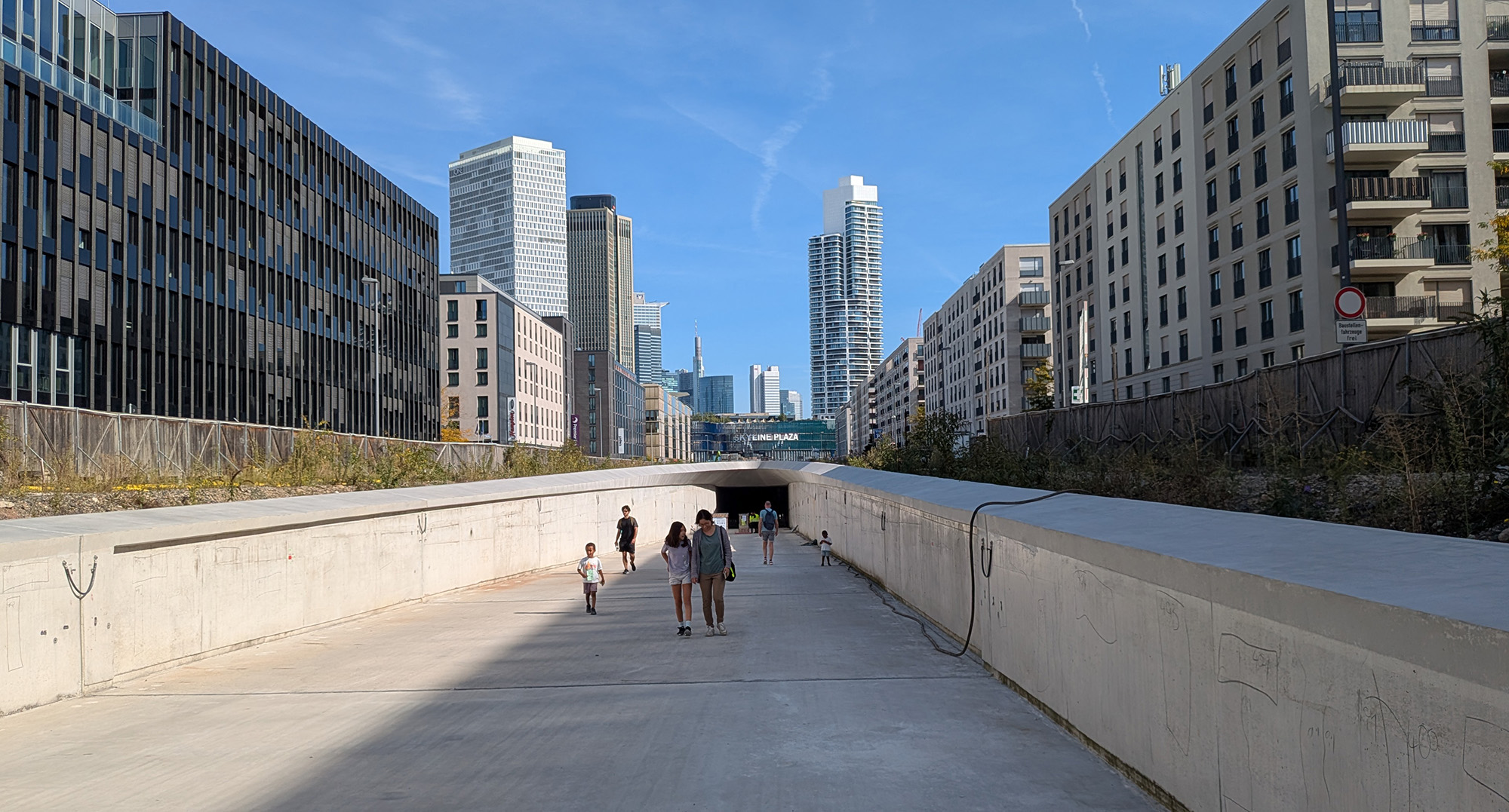 Ende September konnte die von schneider+schumacher gestaltete Einmündung in den U-Bahn-Tunnel der U5 besichtigt werden. Der sogenannte Rampenkragen gestaltet den Übergang des unterirdischen Streckenabschnitts an die Oberfläche in der Mitte der Europa-Allee. Geplant wurde die Tunneleinmündung im Zuge der Verlängerung der Linie U5 vom Frankfurter Hauptbahnhof aus um vier Stationen Richtung Europaviertel.